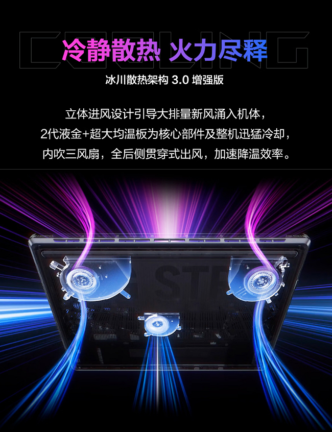 为确保玩家能获得稳定可靠的游戏体验,ROG魔霸新锐2025搭载有冰川散热架构3.0增强版,拥有三风扇、大面积均温板、CPU液金、三明治结构冰翼鳍片等组件,同时采用内吹技术与全后置出风设计,散热十分高效,手动模式下核心总功耗可达195W。