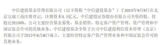 公开资料显示,中信建投基金于2013年9月9日在北京完成工商注册登记,中信建投证券股份有限公司全资控股,持股比例100%。