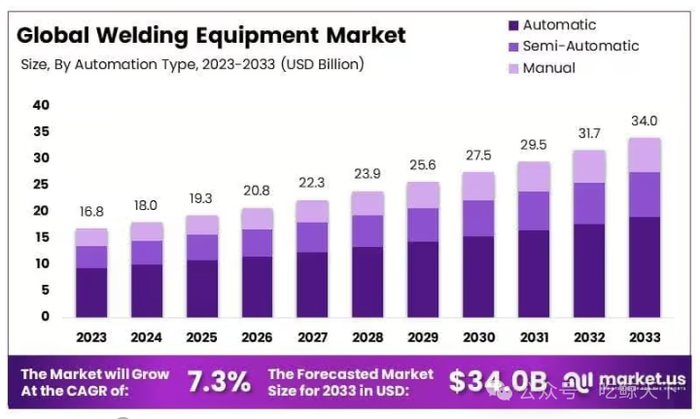 先来看市场。根据Market.us发布的报告,全球焊接设备市场正在经历加速增长:2023年市场规模为168亿美元,预计到2033年将扩大至340亿美元,十年间几乎翻倍,年均复合增长率达到7.3%。这一增速不仅源于工业制造的持续需求,更来自北美等地区家庭用户对DIY维修、自主改装等轻量化应用场景的持续扩张。
