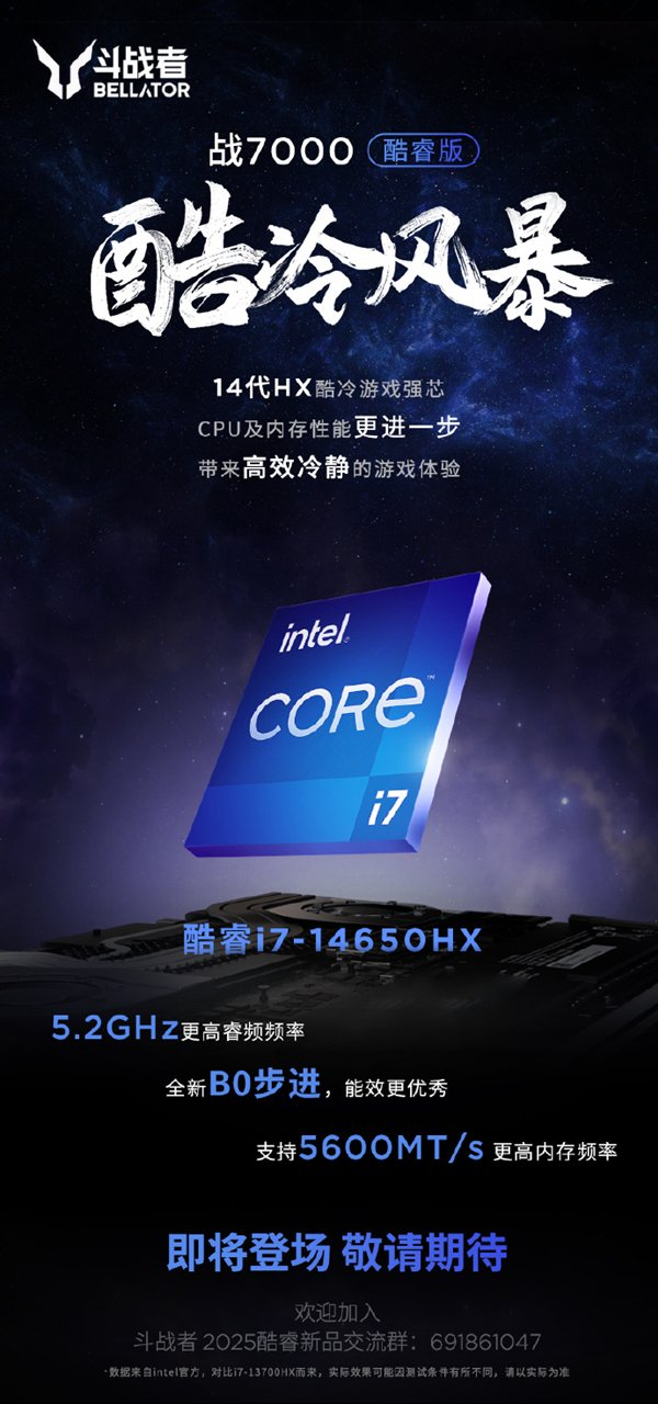 快科技7月25日消息,联想来酷斗战者官方确认,旗下战7000酷睿版游戏本将搭载英特尔酷睿 i7-14650HX 处理器。