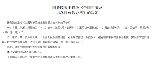 据了解,2024年11月,国务院发布关于修改《全国年节及纪念日放假办法》的决定,自2025年1月1日开始施行,同时发布关于2025年部分节假日安排的通知。