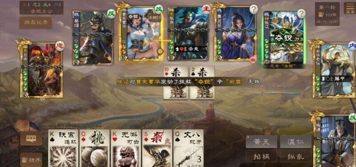 轮到我们行动时,先让二曹对张角随意攻击——张角手上有三张牌,其中一张是用佐练换来的杀,另一张是通过鬼道获得的青钢剑,还有一张未知。考虑到之后神辽的表现不太像忠臣,而薛灵芸可能是玩家在测试新将(这一局是在她刚上线不久打的),身份难以判断。反贼方整体局势并不占优,因此只能冒险赌张角没有闪来打破僵局。最终二曹出手攻击张角,张角掉血并触发招祸,被火属性杀击中。随后我们对老仙和薛灵芸施加铁索,并给二曹、蔡瑁以及自己发牌,回合结束。