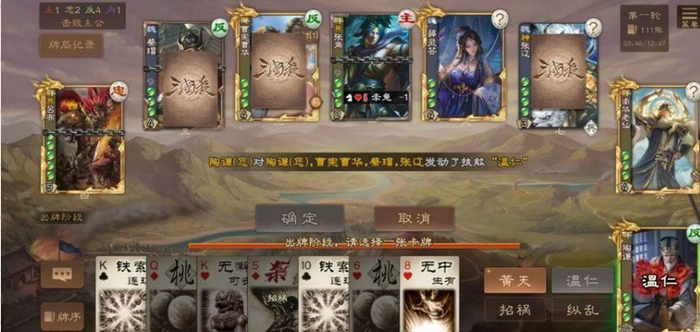 本局中,陶谦每回合通过纵乱和招祸限制主公,逐步打开局势,为胜利奠定基础;招祸牌不仅提升爆发力,也成为击杀主公的关键。从第一回合便可见温仁强大的补牌能力。