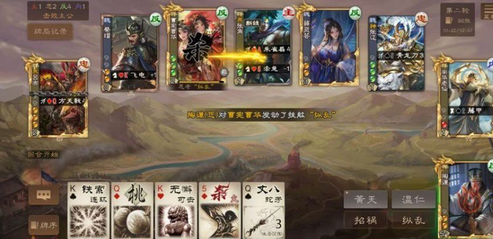 陶谦每回合发动纵乱指令,若目标所在攻击范围内有至少两名敌人,则理论上可创造四次收益机会。每次出杀命中可获得三点收益:扣除目标一点体力、触发祸首摸牌效果并迫使其弃牌;未命中则消耗一张闪避牌,仅获得一点收益。在50%的闪避概率下,平均每回合可获得两点收益。
