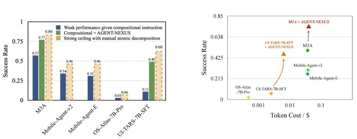 Agent-NEXUS 调度框架有效地弥补了原子到复合任务的泛化损失,在成本提升可控的同时让任务完成率大幅提升,逼近了 strong ceiling 的表现。