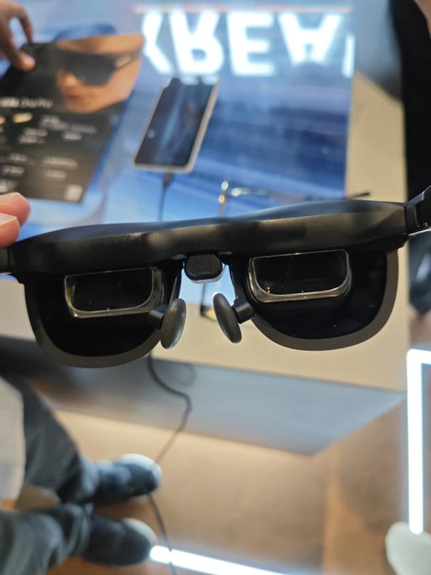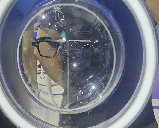 而今天的Xreal展台则带来了不一样的体验,作为业内少见的在内部搭载屏幕的眼镜,其能带来更加突出的视野感受。新浪科技体验后发现,佩戴时屏幕与眼镜的视距和正常在电影院的视距感知类似,如果近视则会出现一定的模糊,但Xreal可以根据度数进行插片调整。