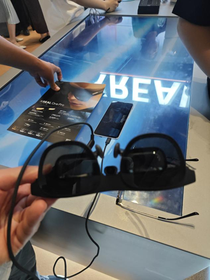 感知方面,在看向漆黑处时非常接近电影院,由于没有强光的干涉,屏幕可以占据整个视野。有些遗憾的是,本次展出的产品为XREAL One,刚刚发布的Pro版本并未来到现场。