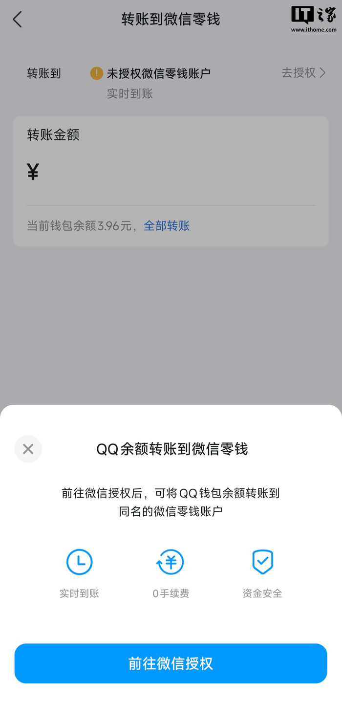 用户需要前往微信授权,之后便可以将 QQ 钱包余额转账到同名的微信零钱账户,并且 0 手续费。