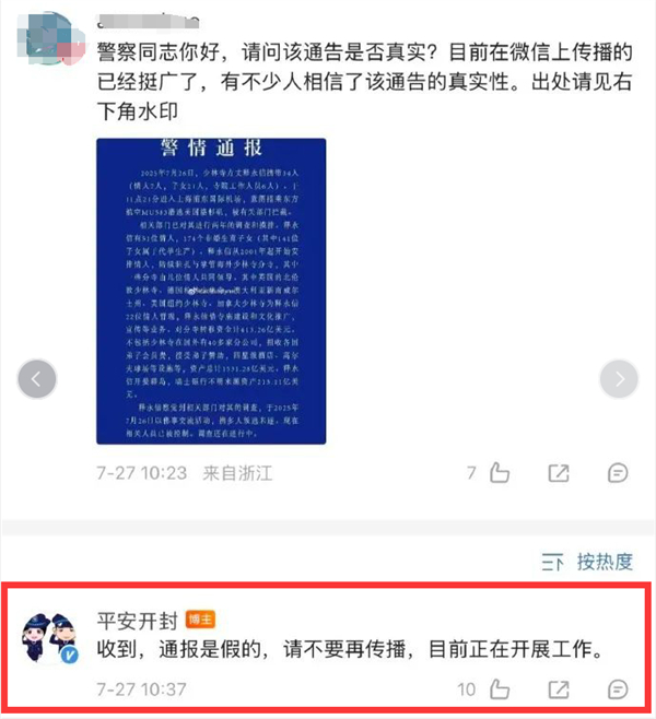 此前,一张伪造的“警情通报”在网络疯传,声称“释永信携带情人、子女等34人潜逃美国被拦截”,开封警方迅速辟谣,明确表示“通报为假,相关工作正在开展”。