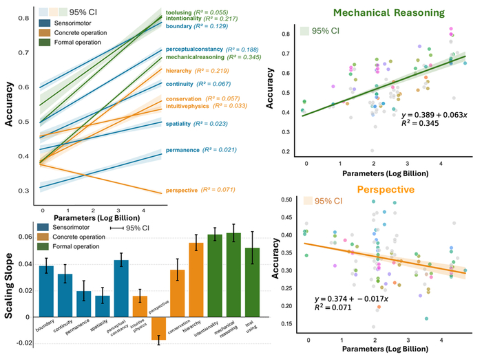 3. 增加模型规模并不能显著提升基础认知能力:研究显示模型的基础认知能力无法通过简单扩展规模获得显著提升。尽管模型参数量提升带来了高级推理能力的提升,但对低级认知帮助较小,甚至某些基础能力会出现规模越大越差的反常现象。