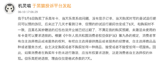 2、有花费五千多元购买年卡的用户发现,园区年卡限制用户预约时间,并且在尚未使用年卡且园区未正式开园情况下,官方仍以购买后超过7天为由拒绝退卡,类似情况并不少见;