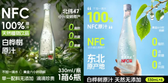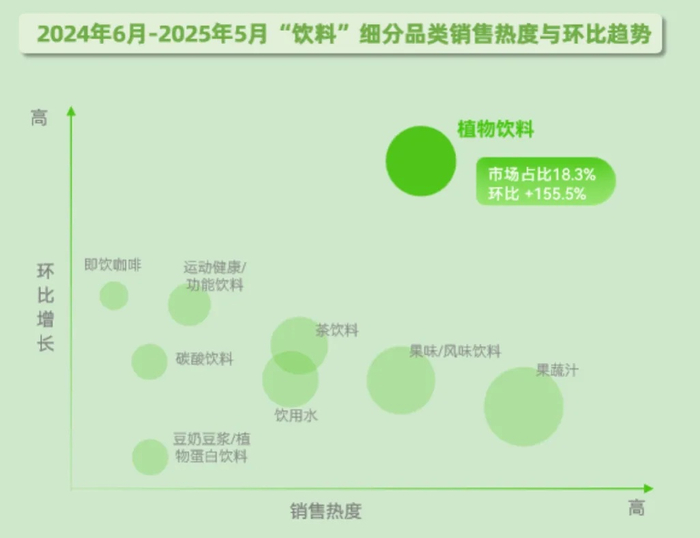 飞瓜数据2025年5月发布的报告显示,在抖音平台饮料销售热度大于1亿的细分品类中,果蔬汁高居榜首,植物饮料次之。更重要的是,自2023年起,植物饮料的市场重心已明显从传统的五谷杂粮(红豆薏米)、枸杞、菊花等,向融入珍稀食材(如白桦树汁) 和采用NFC/HPP等先进工艺的水果化、高维C、高颜值方向迁移。