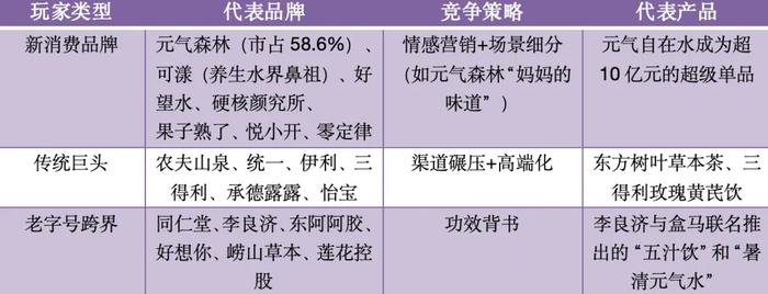 传统巨头中,农夫山泉、统一、伊利、三得利等凭借碾压级的渠道覆盖力和品牌积淀强势介入,并积极推动产品高端化。