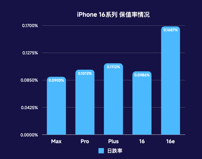值得注意的是,售价最低的 iPhone 16e 并未因价格优势带来更低的使用成本。从保值数据来看,iPhone 16e 的日均贬值率反而在全系列中排名靠前,其每日跌价占比为 0.1687%,远高于其他型号。这意味着,对于追求长线持有与转售价值的用户而言,低价不一定等于高性价比,反而可能因跌价过快,拉高了实际的日常使用成本。
