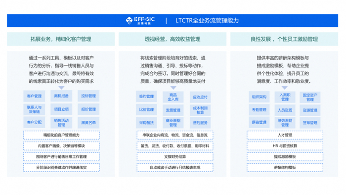 ·全业务流管理能力:业务集成化管理,解决从项目机会到客户回款再到员工激励的全业务流程问题。