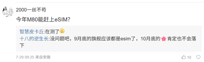 ”,博主回复道:“混合制程”;另一位用户询问道:“今年 M80 能赶上 eSIM”?博主则回复道:“在测了”。