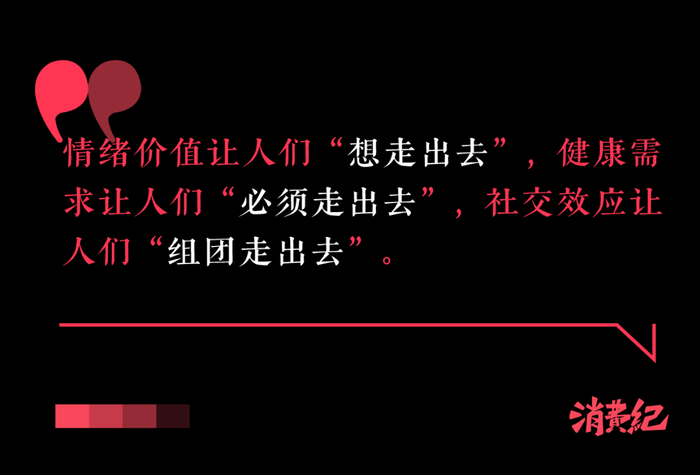 这三种需求像三条支流,最终汇成了户外消费的大河。情绪价值让人们“想走出去”,健康需求让人们“必须走出去”,社交效应让人们“组团走出去”。