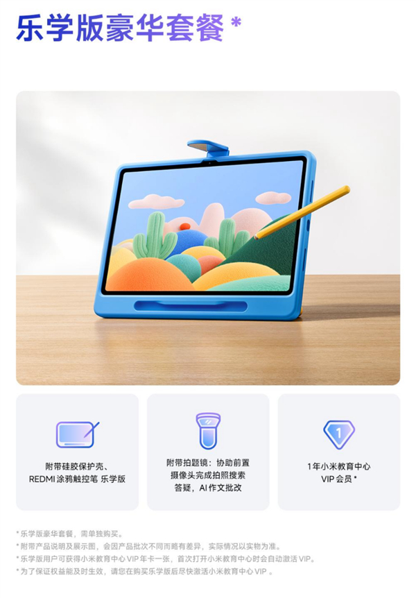 据介绍,乐学版套餐附带硅胶保护壳、REDMI涂鸦触控笔乐学版、拍题镜、1年小米教育中心VIP会员。
