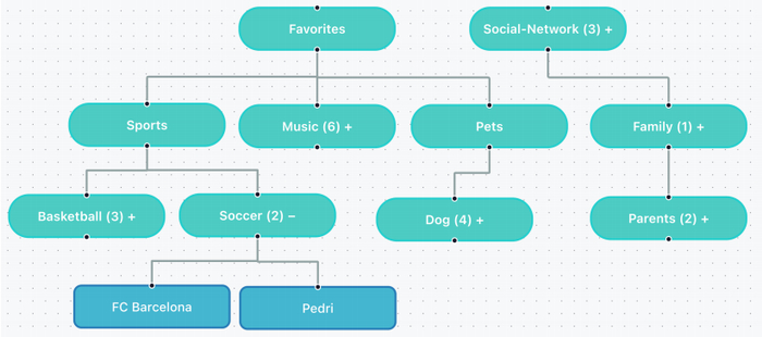 图丨语义记忆树结构示例。在本示例中,用户使用的语义记忆用于存储新概念及其关系,其采用多级分类结构,例如社交网络和收藏夹。在收藏夹中,记忆进一步细分为更具体的类别,包括体育、宠物和音乐(来源:arXiv)