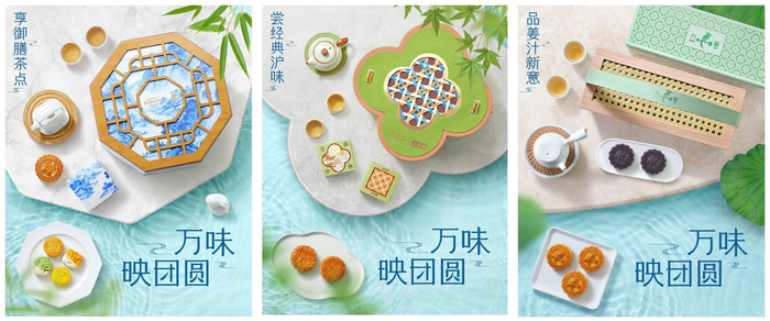 从左至右依次:万豪旅享家®御茶膳房®联名款 |「御飨青韵」月饼礼盒、万豪旅享家®杏花楼®联名款|「花昭月棠」月饼礼盒、万豪中餐厅定制款月饼礼盒