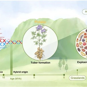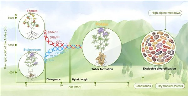 该研究首次揭示了马铃薯组的杂交起源、薯块形成和辐射分化。研究发现,马铃薯组起源于900万年前番茄组和类马铃薯组的一次古杂交事件。