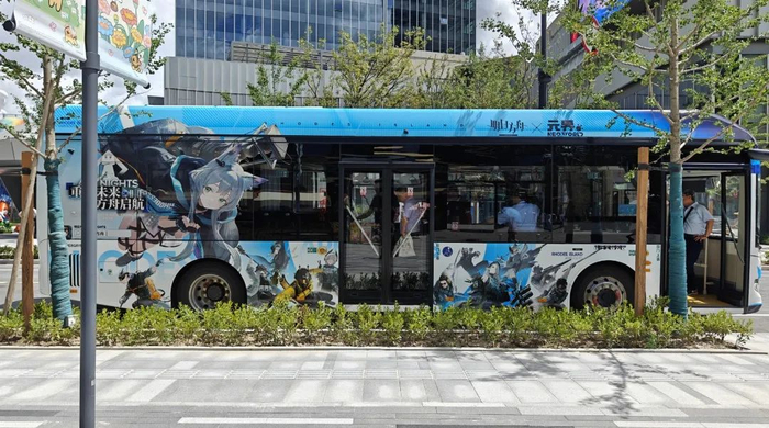 同样在7月上旬,上海徐汇区正式公布了地处漕河泾的“元界Neo World”元宇宙街区。漕河泾本身是汇集了鹰角、米哈游、叠纸等游戏公司的地块,“元界”则以地标模型、路标旗帜等形式,将这些公司的游戏IP具现化,还有一班免费班车负责街区内的短驳——这两辆班车又是《明日方舟》痛车。