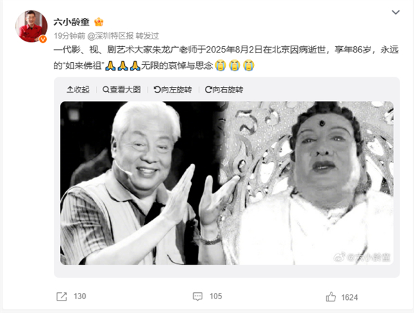 随后,六小龄童发文哀悼:一代影、视、剧艺术大家朱龙广老师于2025年8月2日在北京因病逝世,享年86岁,永远的“如来佛祖”无限的哀悼与思念。