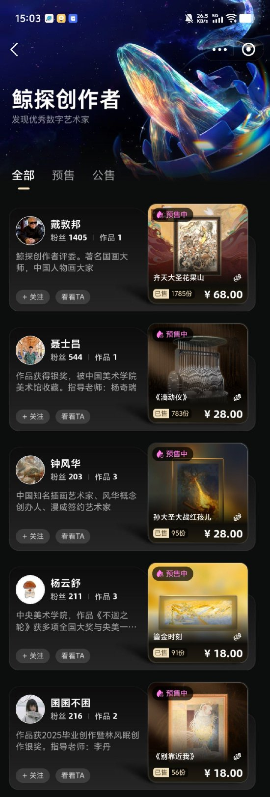 据介绍,鲸探数字艺术展将启用‘预售+公售’模式,根据预售期间市场反馈,确定是否发行、发行量及藏品价格,进一步定量铸造,并开放公售。该平台旨在让更多艺术家被看见,及时获得用户建议与市场反馈,形成“创作-认可-收益-再创作”的正向循环。