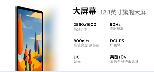 平板搭载一块12.1英寸旗舰大屏,分辨率为2560x1600,支持90Hz高刷新率、DCI-P3广色域、800nits峰值亮度,并且具备DC调光能力,屏幕显示通过了莱茵TUV全局护眼认证。