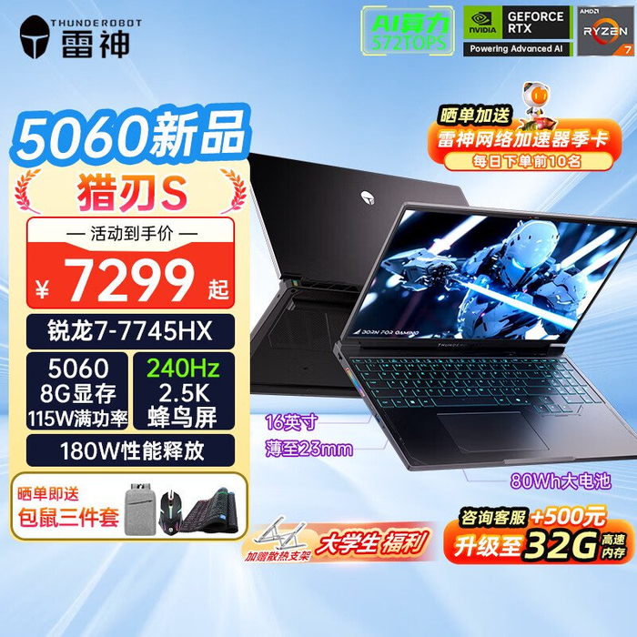 R7-7745HX + RTX5060/5070,7299 元起雷神新款猎刃 S 笔记本上架