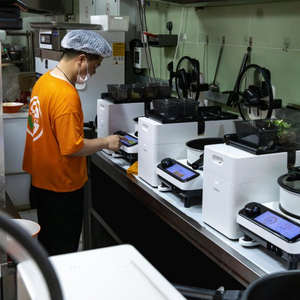 这带给添可向商用领域拓展的契机。商用场景与家庭场景不同,家用炒菜机器人需要有人在合适的时机放入已洗切并配好的菜,而商用炒菜机的自动化程度更高。食万星厨在做到根据智能菜谱自动投调料、自动翻炒的同时,还能自动倾倒配好的食材入锅,1个人可以操作5~6台炒菜机器人。