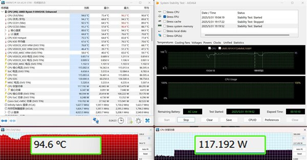 测试平台在高性能模式下,AIDA 64 FPU CPU单烤机测试,处理器稳定功耗释放超过115W,核心温度平均为94.6℃,功耗释放相当强劲,不过温度也确实有点高,整体能效自然是比不上Zen5架构的锐龙9000系列处理器的。