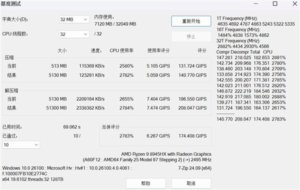 锐龙处理器在压缩/解压缩性能方面有着非常优异的表现,锐龙9 8945HX处理器在7-Zip压缩速度达到了123291KB/s,解压缩速度更是高达2338382KB/s,10轮压缩/解压缩耗时仅69秒,速度极快!