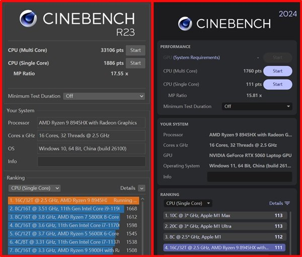 其实总体来说,6-7000元的AMD锐龙9 8945HX游戏本,可以说是当前性价比非常高的N-1配置方案。这颗处理器的CINEBENCH R23单核性能达到了1886分,多核性能达到了33106分。