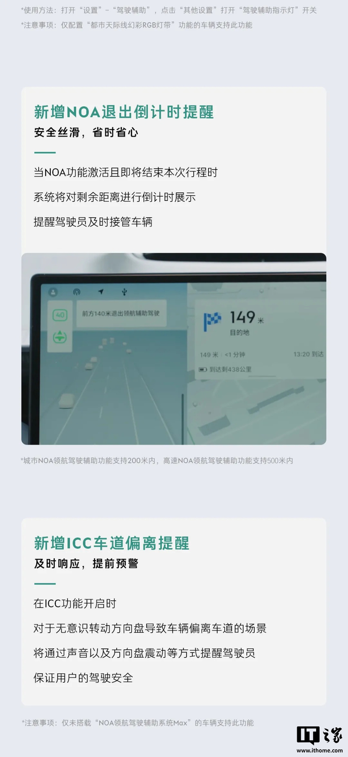 据IT之家了解,新增的城市领航功能开启后,车辆将基于已设置的导航路线,实现 A 点到 B 点的公共道路导航辅助,功能覆盖巡航辅助、变道辅助、避让绕行、红绿灯启停、路口通行、路口调头等场景。在巡航辅助驾驶接近终点时,车辆会对剩余距离进行倒计时提醒,提醒驾驶员提前接管车辆。
