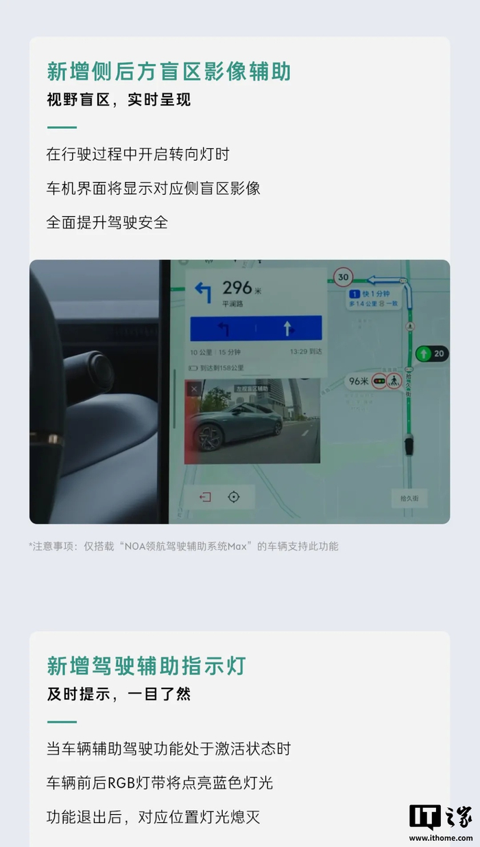 侧后方盲区影像辅助,是在驾驶过程中开启转向灯,车机系统会显示对应一侧的摄像头画面,以此监测盲区,保证行车安全,以上升级适用于搭载“NOA 领航驾驶辅助系统 MAX”车型。