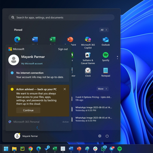部分 Win11 开始菜单跳黄色警告横幅,微软力荐用户订阅 OneDrive 备份系统数据