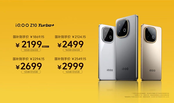 售价方面,iQOO Z10 Turbo+提供四个版本,其中12GB+256GB版本售价2299 元,首销优惠价 2199 元,国补到手价 1869.15 元;12GB+512GB售价2499 元,国补到手价 2124.15 元;16GB+256GB售价2699元,国补到手价 2294.15 元;16GB+512GB售价2999 元,国补到手价2549.15 元,更享6期免息,首销购机享价值 365 元服务全家桶!学生购机额外专享 358 元权益礼包!