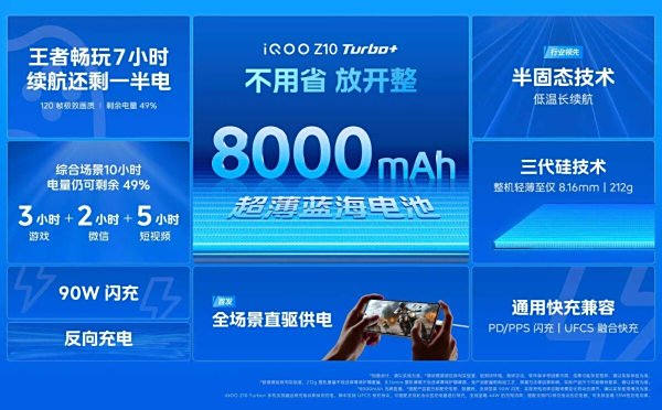 充电方面,iQOO Z10 Turbo+支持90W超快闪充,55分钟即可充满8000mAh电池,并兼容55W PD/PPS 和 44W UFCS 协议,可使用笔记本电脑充电器应急补电。全场景直驱供电技术的加入,让手机在边充边玩时绕过电池直接供电,避免发热并延长电池寿命。