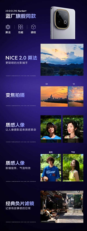 iQOO Z10 Turbo+配备5000万像素索尼大底光学防抖主摄+ 106°超广角镜头,支持多焦段人像、超级夜景及 NC 胶片风格负片滤镜,随手一拍即可出片;LivePhoto 动态照片支持叠加人像算法,分享至社交平台更吸睛。