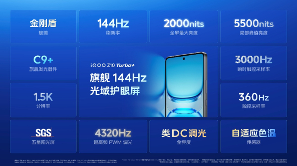 屏幕显示方面,iQOO Z10 Turbo+ 搭载旗舰 144Hz 光域护眼屏,采用华星旗舰 C9+ 发光器件,支持2000nit 全局最大亮度和 4400nit 25% APL(多场景)局部峰值亮度,即便在强光环境下仍能保持清晰可视性。4320Hz超高频PWM调光技术与类DC调光的结合,兼顾护眼效能与视觉舒适度。3000Hz瞬时触控采样率则为射击类游戏提供精准操作保障,实现"手眼同步"的竞技体验。
