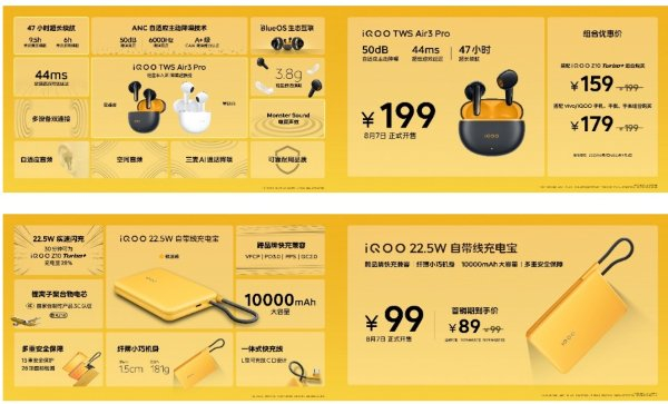 “KPL 推荐耳机”iQOO TWS Air3 Pro 同台登场,具备"星耀黄"与"星钻白"两款配色,带来 50dB 多模式降噪、44ms 全链路游戏低延迟、47 小时最长续航(搭配耳机盒)以及 3.8g 轻巧佩戴,为消费者带来轻松聆听的崭新选择。iQOO TWS Air3 Pro 到手价 199 元起,搭配 vivo / iQOO 手机购买更优惠。同时开售的 iQOO 22.5W 自带线充电宝到手价 99 元,首销期到手价 89 元。