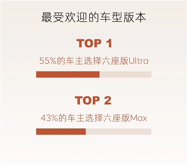 具体来看,乐道L90最受欢迎的版本为六座Ultra版,55%的车主直接上六座Ultra顶配、43%的用户选择六座版Max。