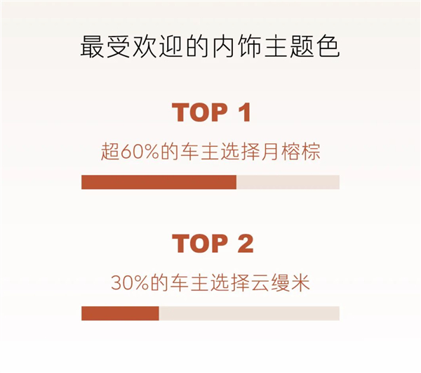 内饰主题色方面,月榕棕、云缦米是最受欢迎的内饰色,分别有60%和30%的车主选择。