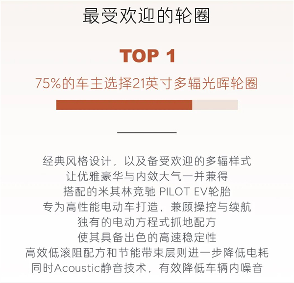 并且,四分之三的用户选择21英寸光晖多幅轮圈,静岳黑、辰辉银、岩脊棕是人气最高的三个颜色,其中,近50%的车主选择静岳黑,近40%的车主选择辰辉银和岩脊棕。