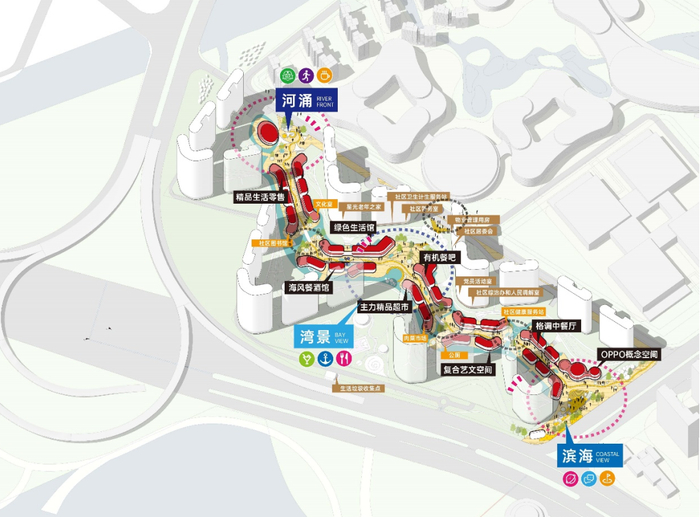 规划布局运用了“化整为零”的设计理念,以滨海波浪形态为灵感,将整个社区划分为五个各具特色的组团,同时营造出一条开放而多元的商街;规划布局注重保护和利用现有的自然景观资源,引入海滨植被。此外,社区还规划了多个生态公园和绿地。
