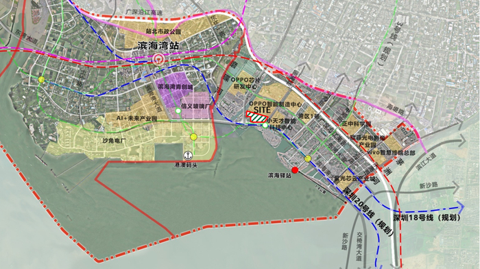 项目南临滨海湾大道,东接振海路及交椅湾西站,北侧 OPPO 智能创造中心,西接福海路及滨海湾大桥。