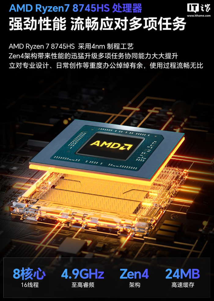 该款笔记本搭载 AMD 锐龙 R7-8745HS 处理器(4nm 工艺、8 核心 16 线程、至高睿频 4.9GHz、Zen 4 架构、24MB 高速缓存),拥有双 SO-DIMM DDR5 5600MT/s 插槽(至高可拓展至 64GB)、提供 1TB PCIe4.0 SSD 硬盘。