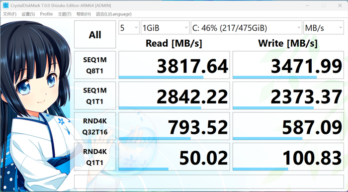 硬盘方面,其搭载的 512GB UFS 闪存的 SEQ1MQ8T1 读取速度为 3817.64 MB/s,写入速度为 3471.99 MB/s。