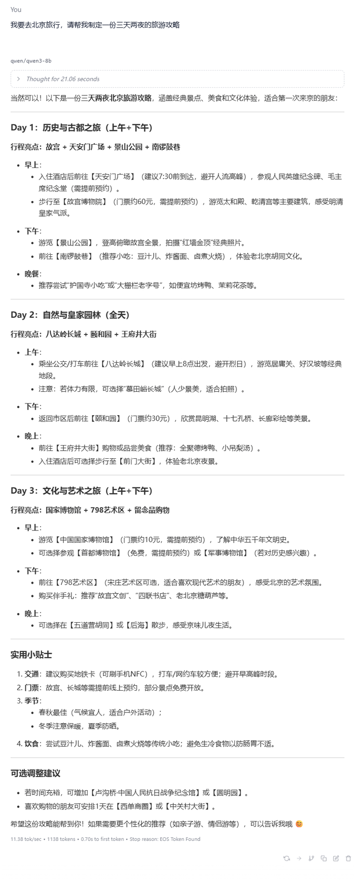 首先小编让模型帮我写一个北京三天两夜的旅游攻略,Qwen3 很快就完成了一份详细的游玩攻略,看着基本没什么问题。